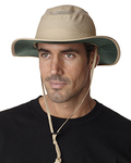 70% cotton, 30% polyester; UPF 45+ protection; Stain-resistant coating; Wide brim; Mesh ventilation insert in crown; Green under visor reduces glare; Adjustable chin strap with pull-up fabric chin lock; Interior self-adhesive closure pocket4”w x 2”h imprint area;