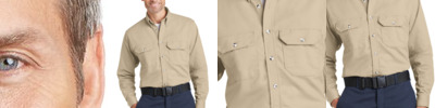 4.2 oz. 80/20 cotton/polyester; 2 chest pockets with button flaps; Button cuffs; Half moon back yoke; Locker loop; Hem bottom;