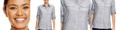 5.4 oz, 80/20 cotton/polyester blend; Ladies Silhouette ; 2 chest pockets with button flap; Roll Up Sleeve; Button cuffs;