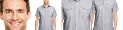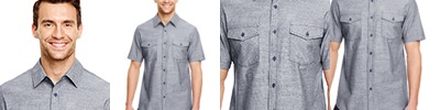 5.4 oz. 80/20 cotton/polyester blend; 2 chest pockets with button flaps; Hem bottom; Button cuffs; Roll up sleeves; Modern Fit;
