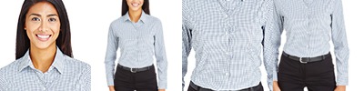 3.9 oz./yd² / 132 gsm, 60% cotton, 40% polyester dobby with wrinkle-free and stain-release performance; Stain-release and true non-iron performance straight from the dryer; Active fit; Patent pucker-free taped seams; Specially fused collar, cuffs and placket for total garment performance; Straight collar with built-in collar stays; Princess seams in front and back for a feminine fit; Fine yarn-count shirting with pealized buttons; Adjustable cuffs with button placket;