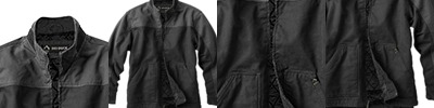 12 oz., 100% cotton Boulder Cloth™ canvas ; Nylon quilted lining with 3 oz. of polyfill insulation ; Zip-thru Funnel Collar; Drop tail with canvas facing to secure the lining; Large insulated front patch pockets; Inside Cell phone & patch pocket; Articulated Elbows;