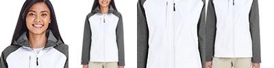 100% micron™ polyester; Micromesh lined nylon body & hood; Water-resistant and wind-resistant; Woven label; Adjustable mesh-lined hood with eyelets and concealed cord locks; Back vent with adjustable closure for full decoration access; Front zippered pockets; Half-elastic cuffs; Open bottom with adjustable elastic hidden drawcord; Drop tail hem;