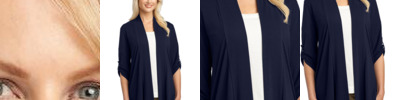 Top off your look in style with this shrug that's equally flattering paired with a skirt or jeans. 4.4-ounce, 62/33/5 poly/rayon/spandex Button tab on sleeves Shawl collar Sloping front hem